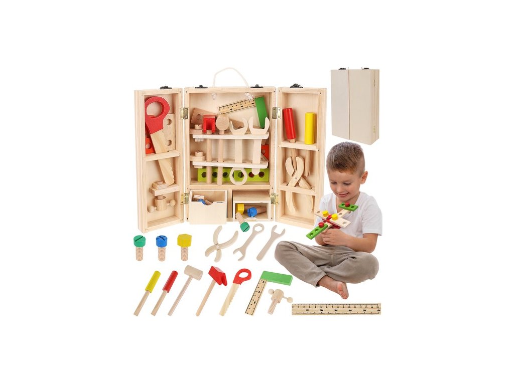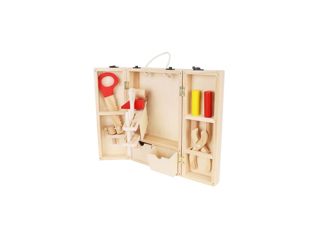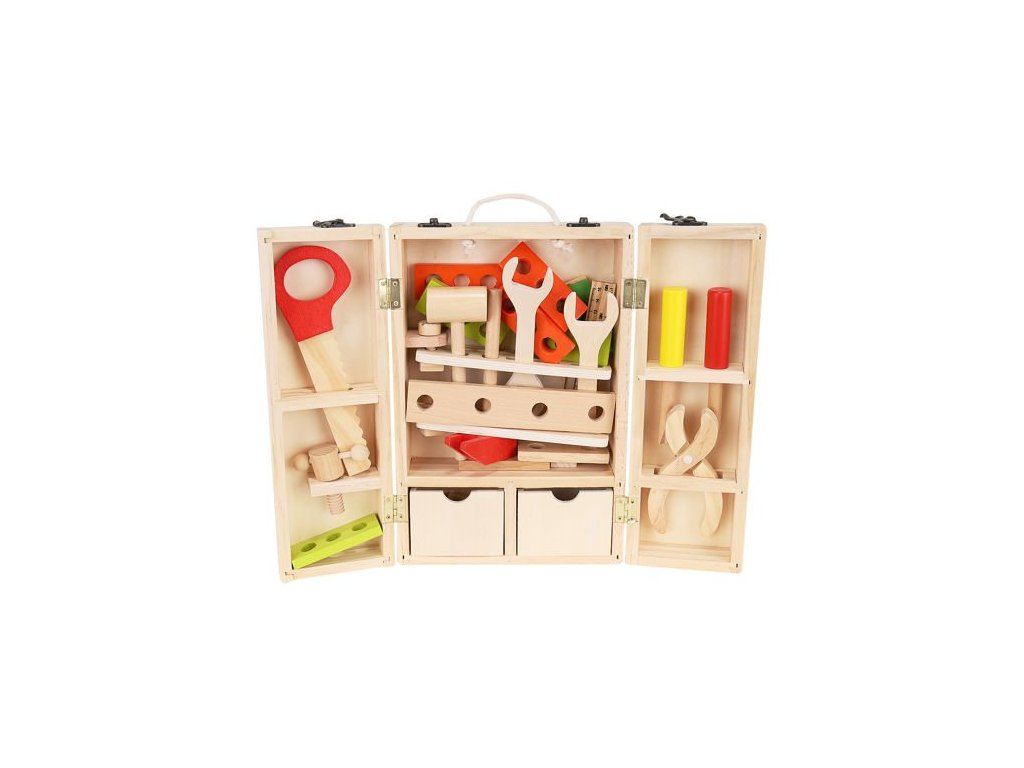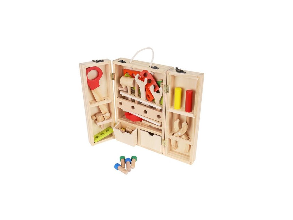 KRABICE + SADA DŘEVĚNÉHO NÁŘADÍ – Sada obsahuje krabici a příslušenství jako jsou: šrouby, matice, pila, kladiva, desky s otvory, šroubováky, kleště, pravítko a úhelník. Box má také pohodlnou rukojeť ze silného provázku. Uvnitř krabice je mnoho přihrádek a míst pro uložení všech nástrojů. Hračka je vyrobena ze dřeva a natřena barvou nezávadnou pro zdraví dítěte.