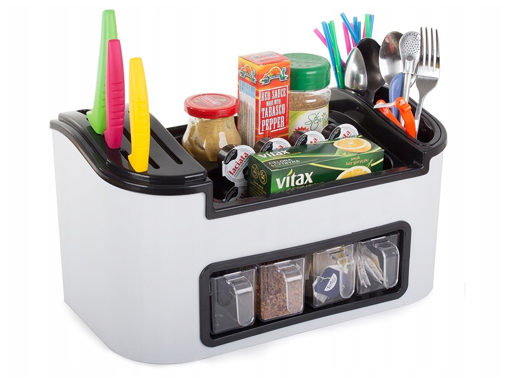 Všestranné ukládání: Tento organizér je navržen pro uložení různých kuchyňských příslušenství, včetně nožů, příborů, špachtlí a koření. Jeho mnohoúrovňová konstrukce poskytuje snadný přístup k často používaným kořením, sklenicím a lahvičkám, které můžete uložit na horní úroveň.