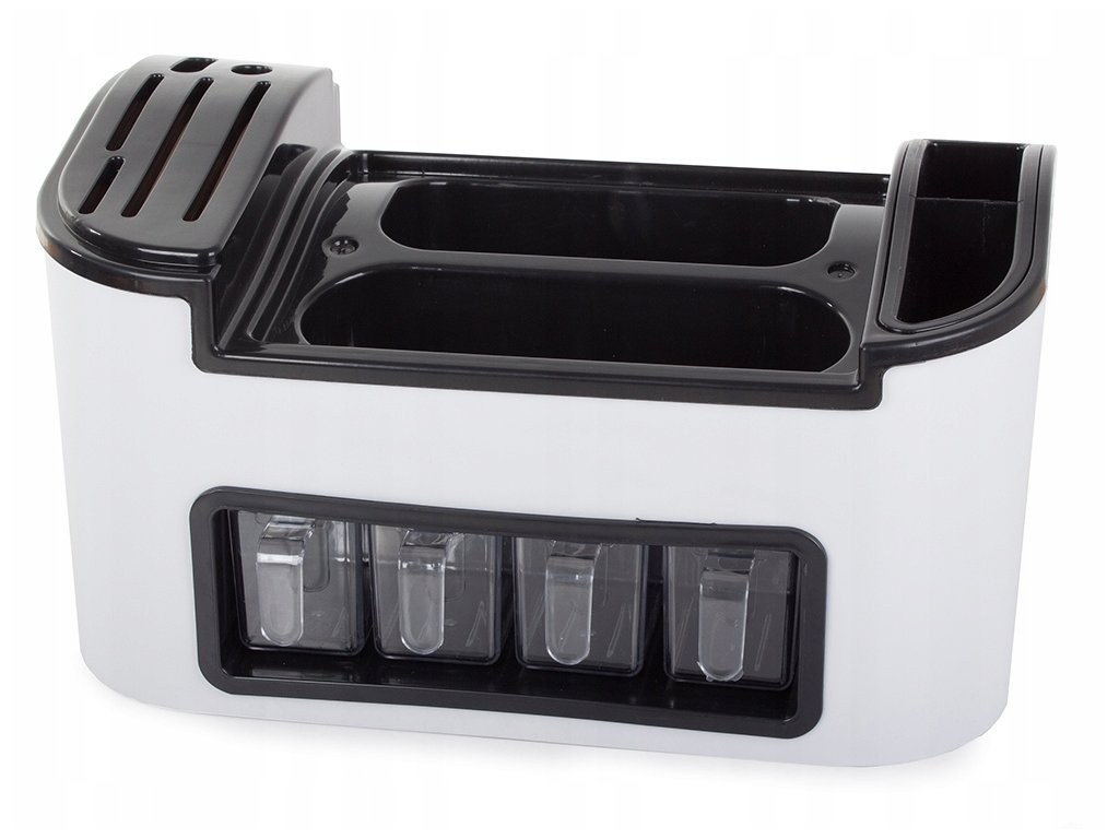Flexibilní umístění: Organizér může stát na kuchyňské lince, parapetu, nebo být zavěšen na stěnu díky integrovaným zavěšovacím dírám, což jej činí flexibilním řešením pro různé kuchyňské prostory.