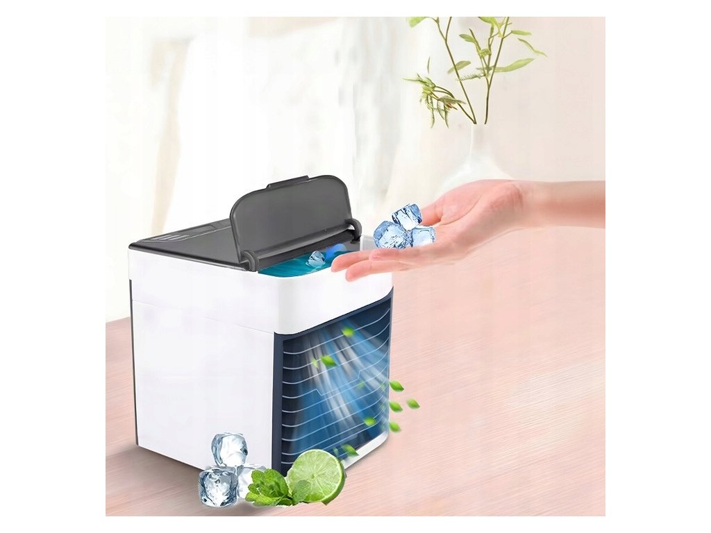 Mini klimatizace je perfektní řešení pro horké letní dny doma nebo v práci. Toto kompaktní zařízení dokáže výrazně snížit teplotu v místnosti a díky svým malým rozměrům (14,5 cm x 17 cm x 16 cm) jej lze umístit prakticky kamkoli, například na stůl nebo skříň. Klimatizace je vybavena lehkým barevným osvětlením RGB, které svítí měnícími se barvami a lze jej ovládat tlačítkem na horní straně zařízení.
