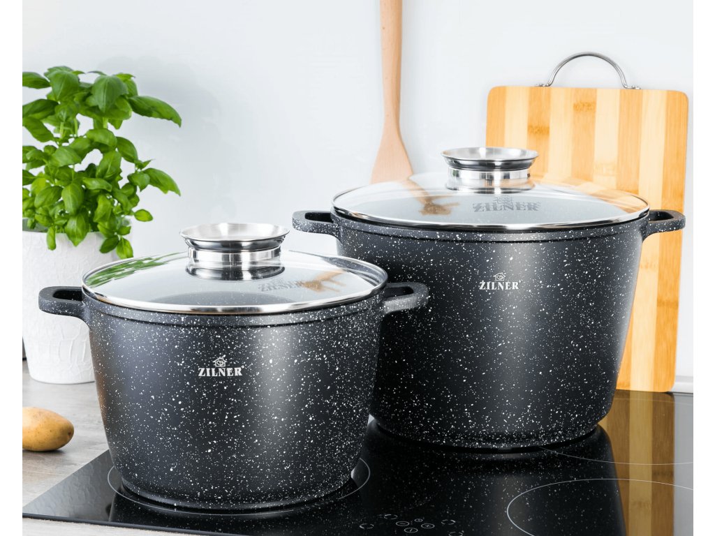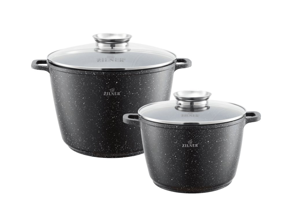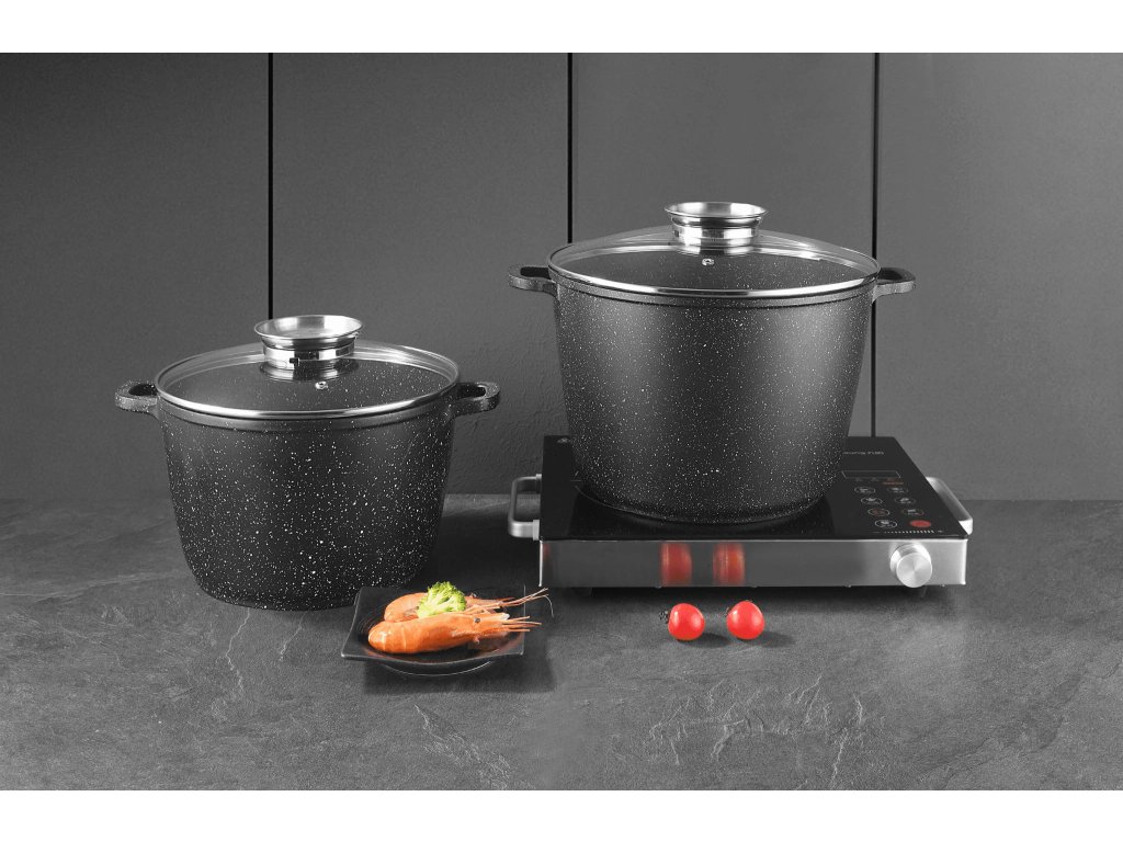 Vysoce kvalitní set dvou mramorových hrnců o průměru 28 cm (10,2 l) a 24 cm (6,2 l) se skleněnou poklicí. Hrnce jsou vyrobeny z hliníkového odlitku, který je pokrytý nepřilnavou mramorovou povrchovou úpravou.