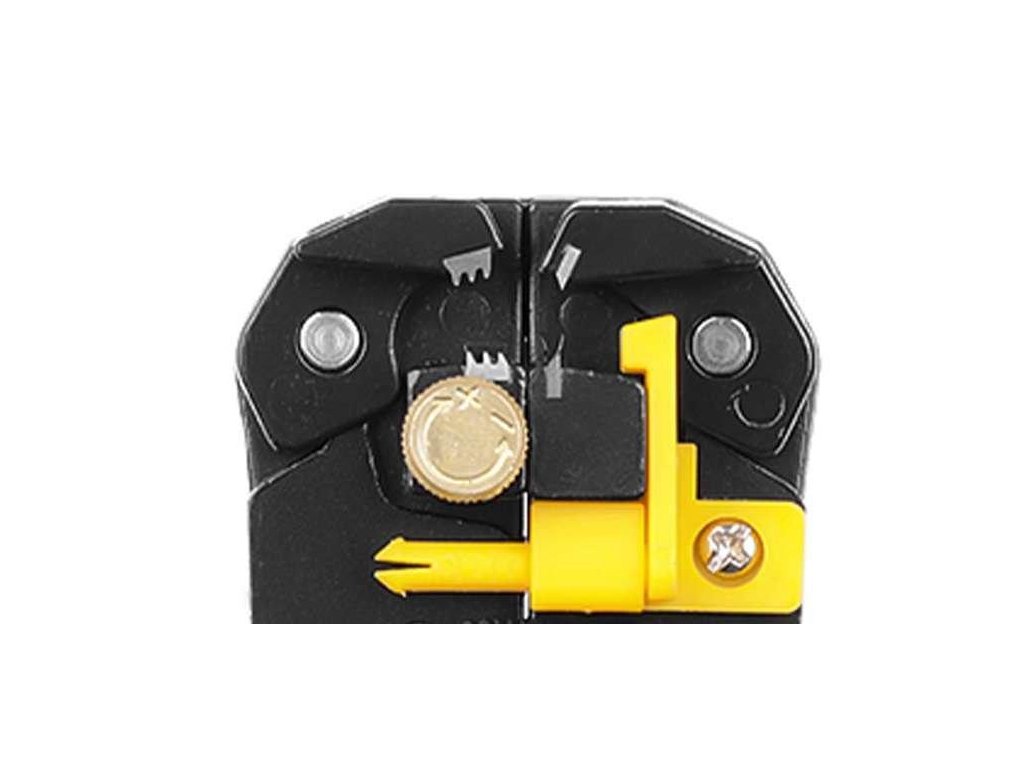 NASTAVENÍ SÍLY + OMEZOVAČ - zařízení má malý knoflík umístěný pod čelistmi. S jeho pomocí můžete upravit přítlak na izolaci, takže se nemusíte bát poškození drátu při práci. Stahovák má navíc nastavitelný omezovač délky.