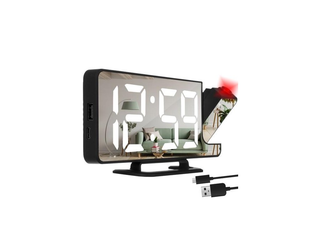 - 4v1 - hodiny, budík, zrcadlo a projektor ! Vše v jednom kompaktním zařízení. Budík je vybaven zrcadlovým čelem, na kterém se zobrazují informace jako je čas. Kompaktní rozměry a nízká hmotnost vám umožní vzít si jej na cesty. Skvěle se bude hodit i při spaní ve stanu, kde zrcadlové čelo umožňuje rychlý make-up a účes.