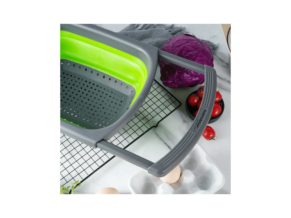 Díky modernímu šedo-zelenému designu se cedník hodí do každé kuchyně, a závěsný štítek umožňuje jeho pohodlné skladování.