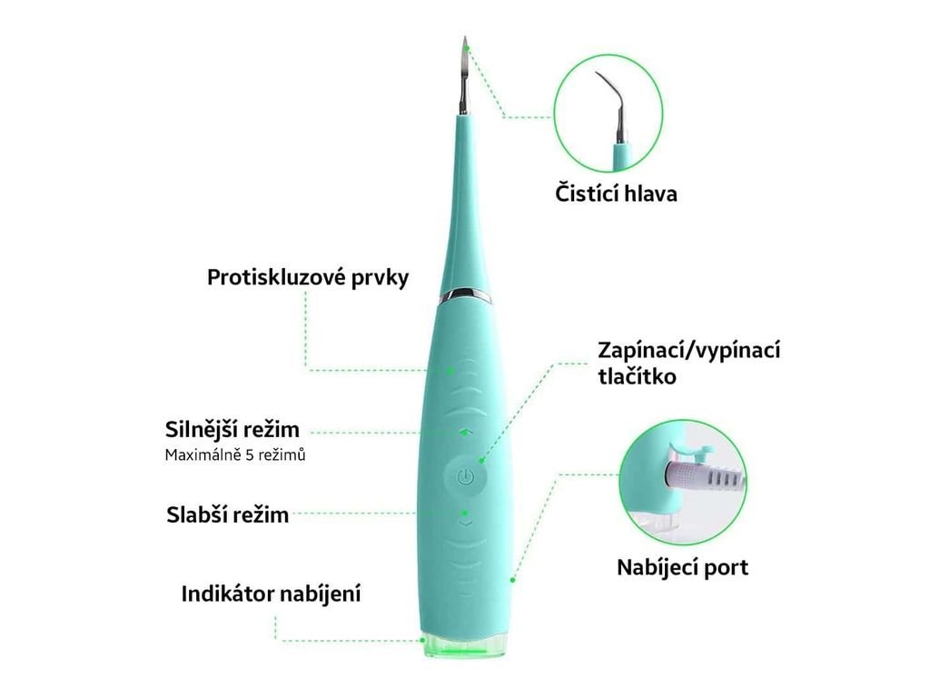 Ultrazvukový čistič zubů dokáže účinně odstranit zubní plak, zubní kámen, skvrny, a díky odstranění zubního kamene ze zubů zabraňuje onemocnění dásní.