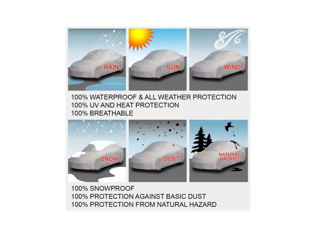Luxusní plachta na auto je vyrobena z odolného materiálu s vysokou životností a několika stupni ochrany. Ochrání Váš vůz a jeho lak od slunce, vlhkosti, deště, sněhu, prachu, špíny, odřenin a ptačího trusu. Plachta sama je ošetřena proti promoknutí a plísním. V předu a vzadu má plachta pevnou a pružnou gumu, která zajistí, že plachta zůstane tam kde má být. Nepoužívaná plachta je skladná a zabere málo místa. Dodáváme v průhledném plastovém obalu s uchy, ideální pro uskladnění po použití. Námi dodávaná plachta nemá uši na boční zrcátka. Velikost plachty určíte snadno, když si změříte délku, šířku a výšku karoserie v linii, podle změřených rozměrů pak zvolíte typ plachty z naší nabídky. Ochranná plachta Luxury Car Cover ušetří čas v zimním období, kdy nemusíte ometat sníh a v letním období snížíte teplotu ve voze a uchráníte ho před slunečním UV zářením.