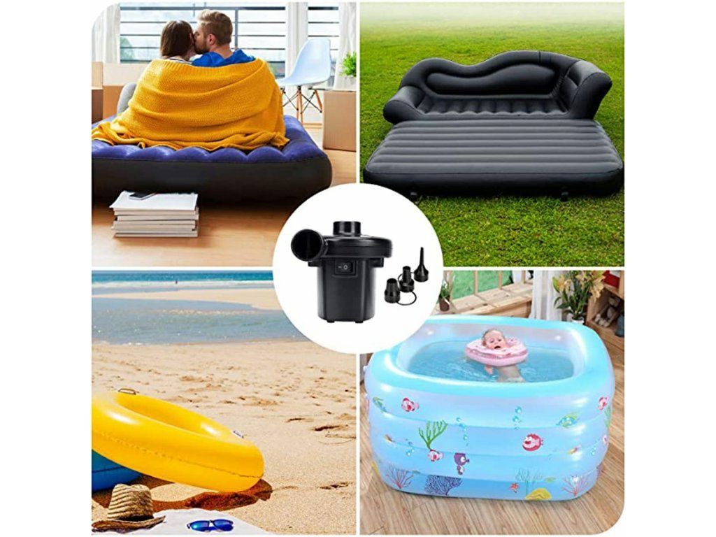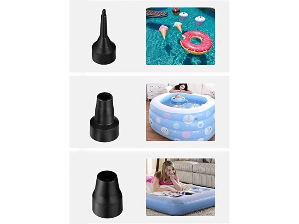 Pumpa má 3 různé trysky (průměr 0,6 / 1,1 / 1,7 cm), takže ji můžete použít k nafouknutí mnoha různých nafukovacích doplňků, jako jsou matrace, míče, čluny, nafukovací hračky, bazény.