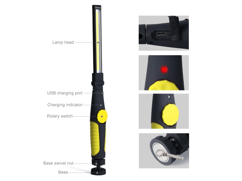 Přenosné pracovní světlo s magnetem BL-W55 vybavené nabíjecím kabelem USB, díky kterému můžete světlo kdykoliv nabít. Světlo je dále vybaveno speciální magnetovou základnou a výkonným magnetem, který je dostatečně silný, aby se připevnil na všechny kovové povrchy. Je to velmi užitečné, když potřebujete mít obě ruce volné. Tato svítilna má vestavěný vysoce svítivý LED panel, tvořený 25ks led diod, uspořádaných do světelného pásu. Lampa poskytuje 100-700 lumenů jasu, lze nastavit podle potřeby od nízkého jasu po vysoký jas pomocí kulatého tlačítka. Otočná základna o 360° vám dává větší možnost při výběru vhodného úhlu osvětlení. Pracovní lampa je vhodná pro vnitřní i venkovní aktivity, např. použití v domácnosti, opravy automobilů, venkovní táboření. Tuto LED pracovní lampu lze použít také pro procházky se psem, turistiku, lov atd