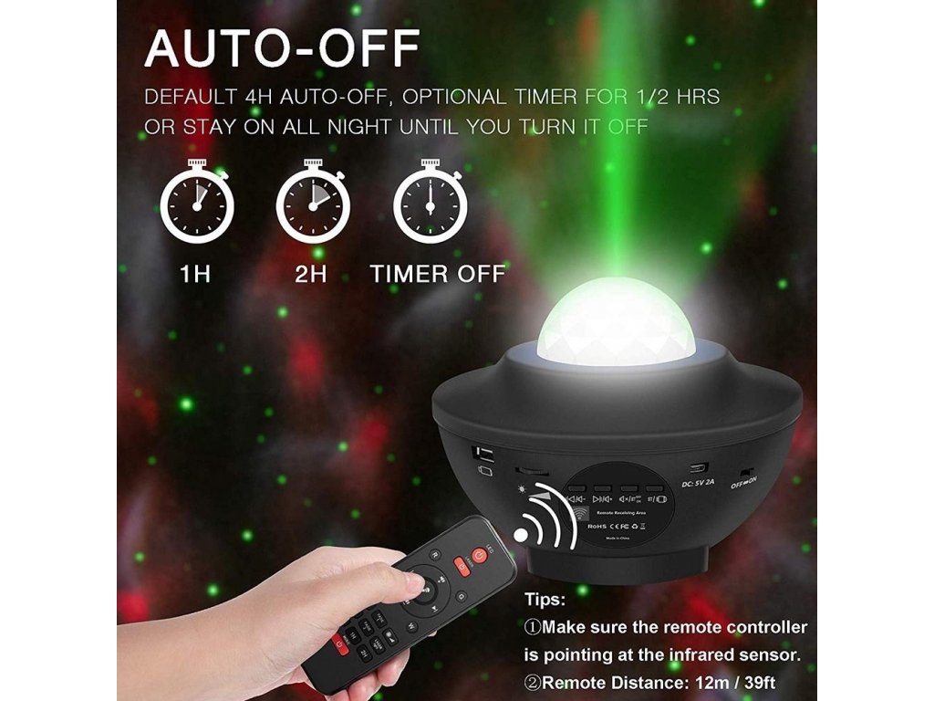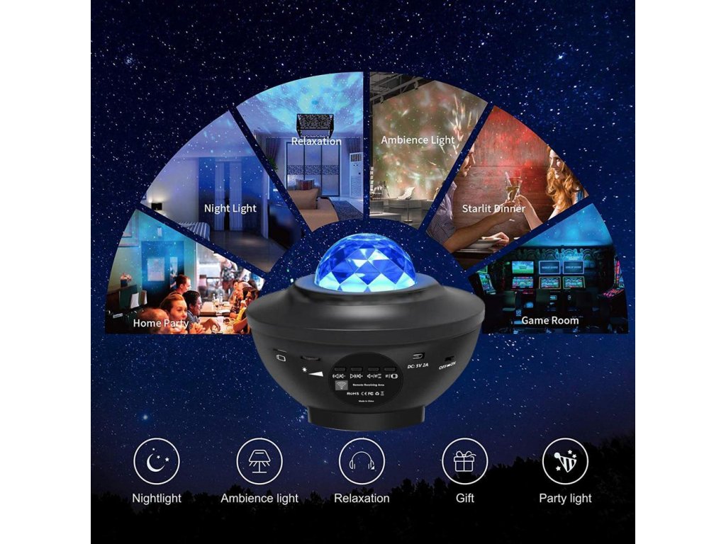 Multifunkční projektor funguje jako lampa, projektor a hudební přehrávač. Projektor pro noční osvětlení používá barvy modré, červené, zelené a bílé k vytvoření nádherné projekce. Světlo se promítá na strop a stěny místnosti, vytváří realistickou hvězdnou noční oblohu, poskytuje uvolňující atmosféru stimuluje představivost dětí a pomáhá jim rychle a tiše usnout.