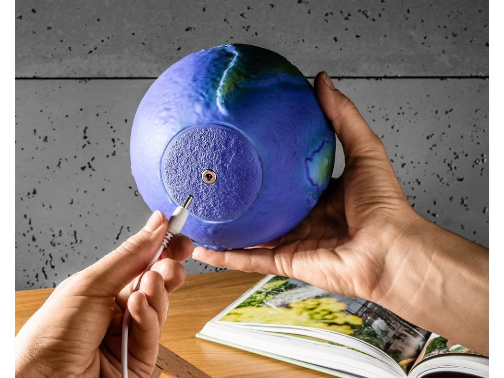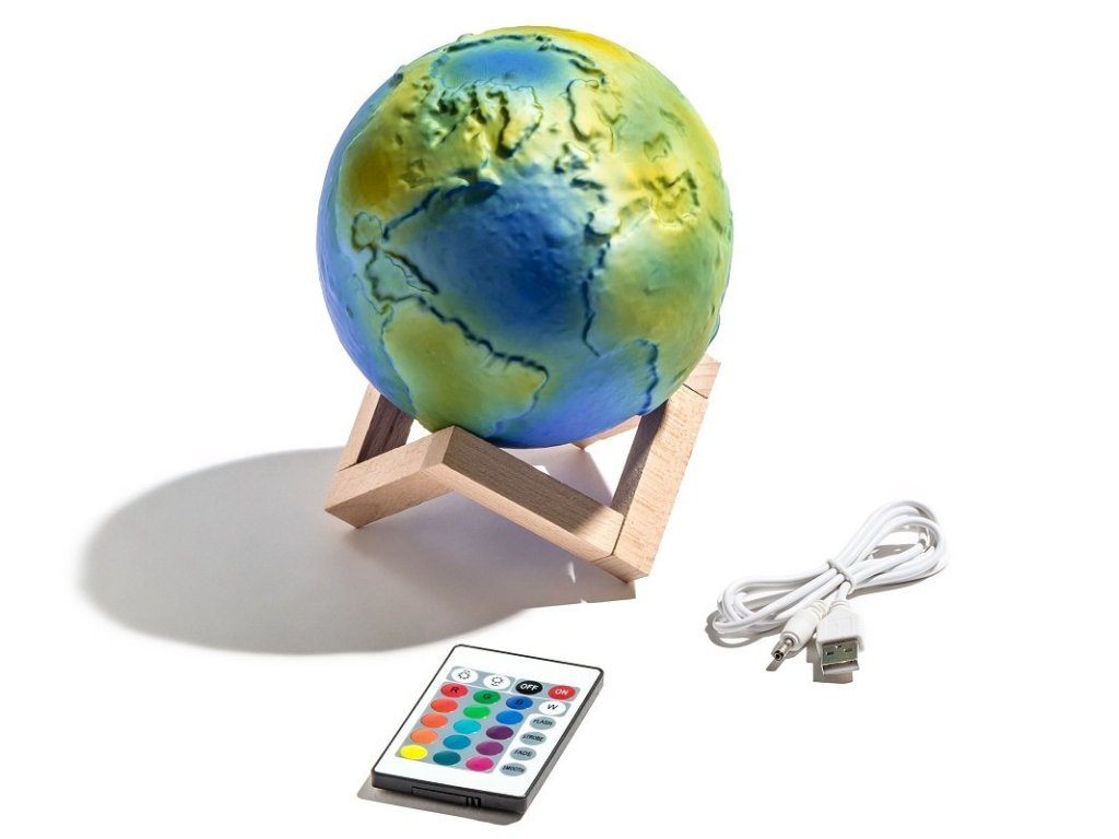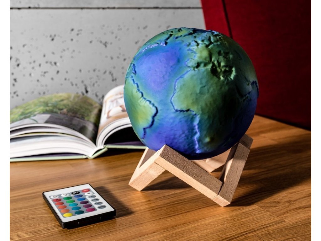 3D lampa Zeměkoule je krásným trojrozměrným znázorněním povrchu naší úžasné planety, kterou lze obdivovat až v 16 barvách. Lampa také připomíná osvětlenou kouli a vypadá stylově prakticky v jakémkoli interiéru, a to jak během dne, tak s osvětlením po setmění. Barvy lze měnit pomocí dálkového ovladače nebo dotykem, stačí připojit lampu k napájecímu zdroji pomocí přiloženého kabelu USB, nabít ji, umístit na stylový dřevěný stojan a poté si několik hodin užívat krásné světlo naší nadpozemské lampy.