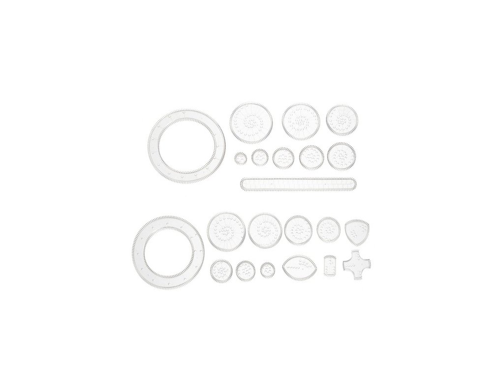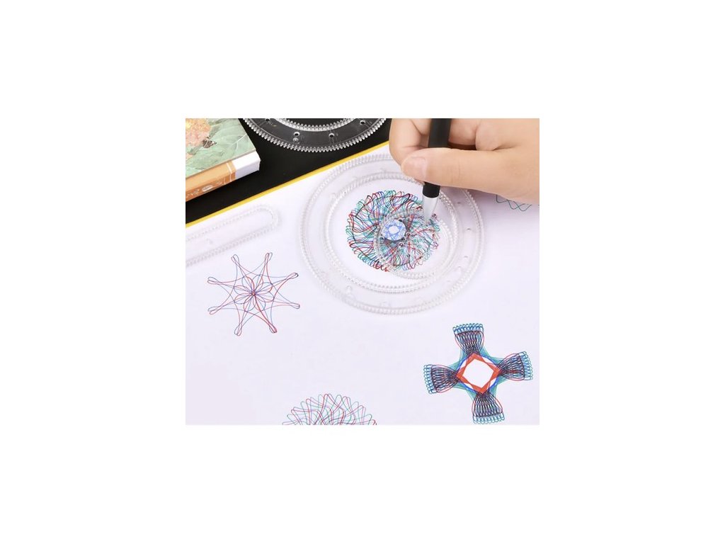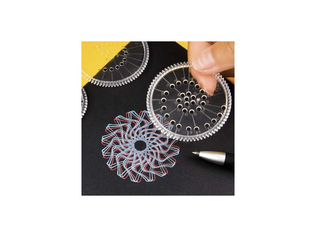 Spirograf je rozdělen na dvě části. První část obsahuje velké kolečko ve tvaru prstence a 7 přídavných koleček s různým počtem otvorů, které umožňují vytvářet jedinečné vzory. Navíc zde najdete geometrické šablony ve tvaru elips, křížů, obdélníků a trojúhelníků, které pomáhají při tvorbě složitějších tvarů. Druhá část sady obsahuje prsten, 8 ozubených koleček a pravítko s půlkruhovým ozubením, které pomáhá vytvářet symetrické křivky.