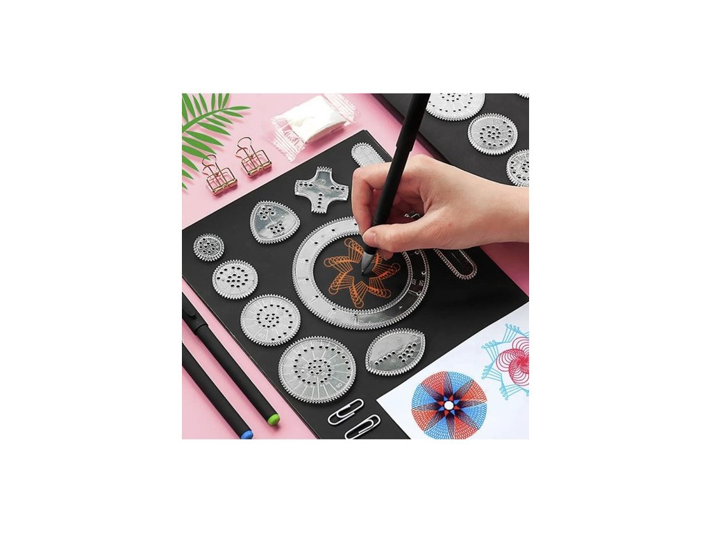 Tento spirograf je snadno použitelný a spojuje zábavu s učením. Stačí umístit kroužek na list papíru, vložit ozubené kolečko nebo šablonu a pohybem pera vytvářet fascinující vzory. Přesné hrany a ozubené povrchy zajišťují, že vytvořené vzory jsou harmonické a kreativní. Tato geometrická hračka je ideální pro rozvoj manuální zručnosti, představivosti a základních geometrických principů.