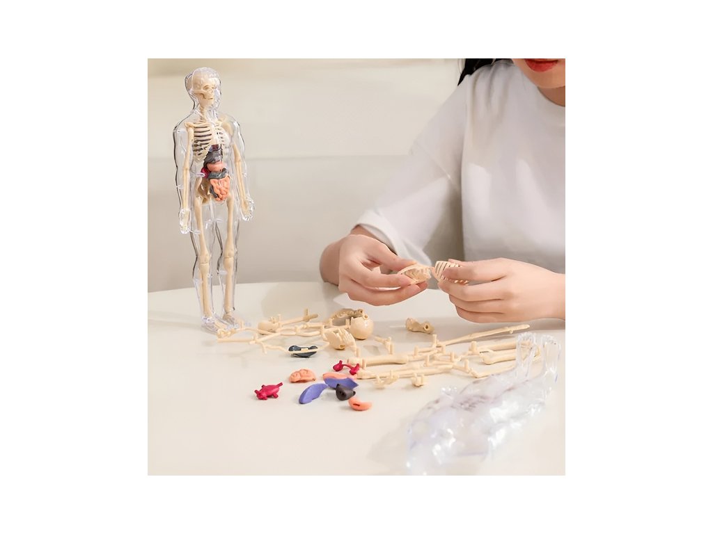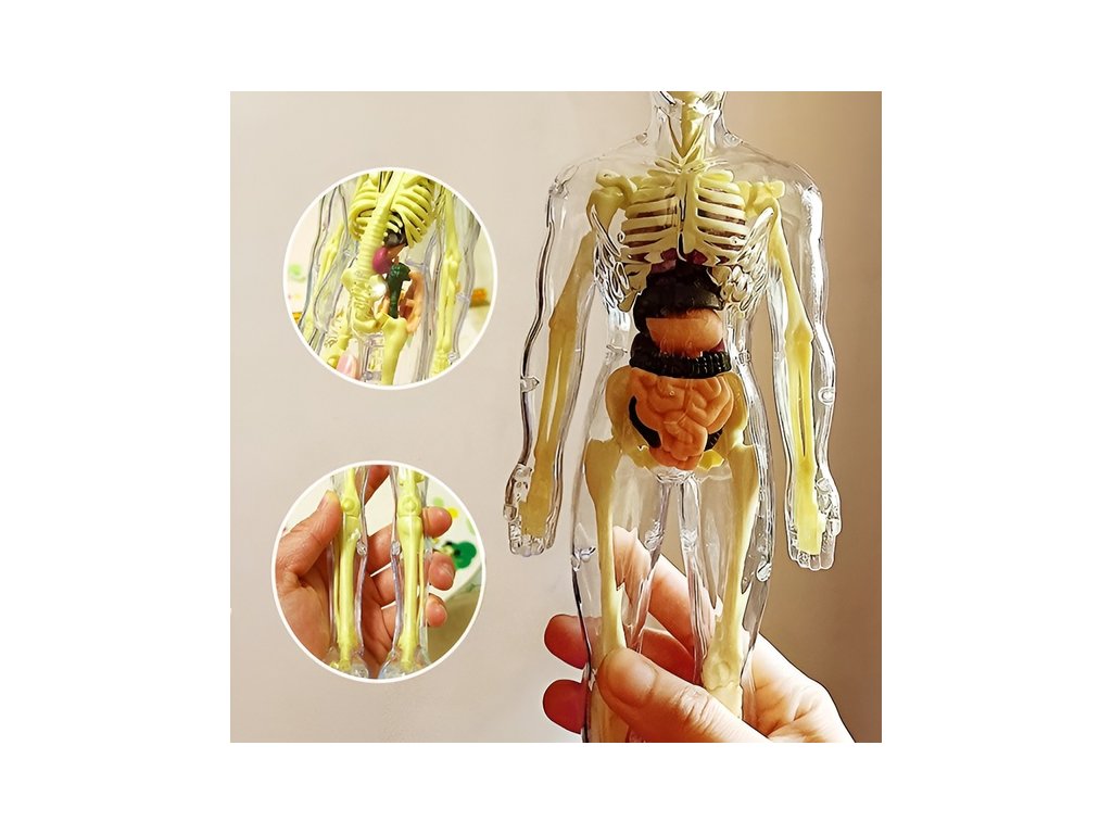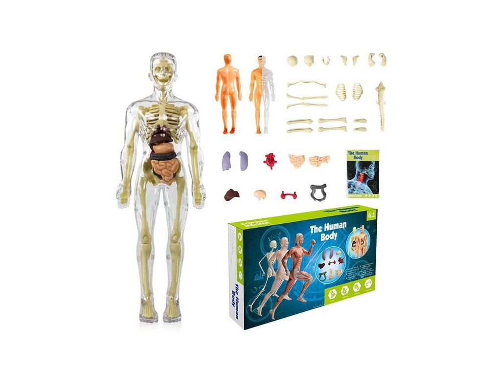 Průhledné části modelu umožňují nahlédnout přímo do nitra lidského těla a pozorovat rozmístění orgánů a kostí bez jakýchkoliv znalostí nebo pomůcek navíc. Odnímatelné orgány a části skeletu si děti mohou vyjímat, prohlížet a opět skládat zpět – díky tomu si snadno zapamatují názvy i funkce jednotlivých částí těla způsobem, který klasické učebnice neumožňují.