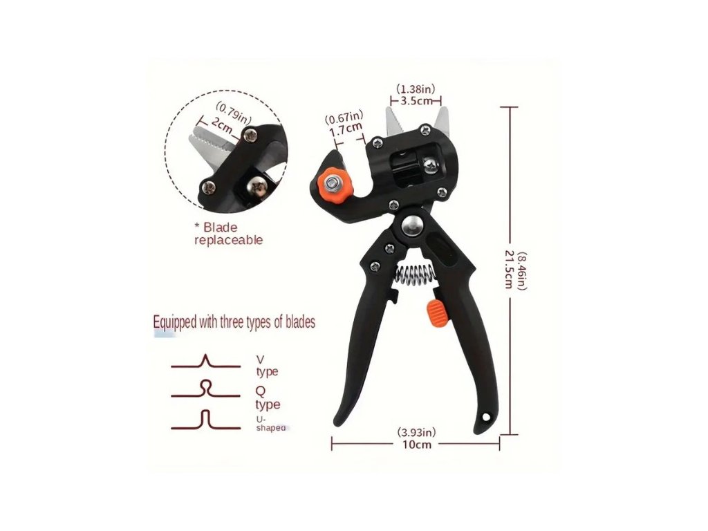 Sada obsahuje 3 vyměnitelné čepele pro různé typy roubovacích řezů – tvar V, U a Ω – které pokryjí naprostou většinu běžných zahradnických technik roubování, štěpování a přípravy řízkování. Výměna čepelí je rychlá a jednoduchá, takže přizpůsobení nástroje konkrétnímu úkolu nezabere ani minutu.